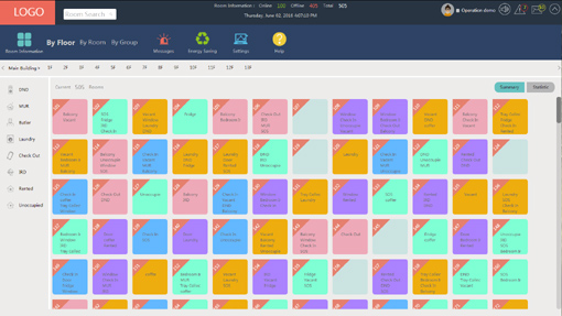 另外,IRS的客房管理系統(tǒng)程序,使用不同的顏色來標(biāo)識房間狀態(tài),讓¬操作人員能清晰的辨別房間的使用情況。同時,酒店員工可通過該系統(tǒng)界面輕松地查看房間各項設(shè)備的運行狀態(tài);對相關(guān)控制設(shè)備進(jìn)行預(yù)設(shè);調(diào)整設(shè)備參數(shù);了解房間節(jié)能情況等。