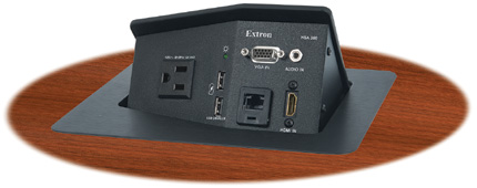 只需輕按一下頂部,連接接口就會慢慢呈現。這樣的設計使它能輕松安裝在會議桌、辦公桌和其它視音頻家具內。一旦安裝完畢,Extron