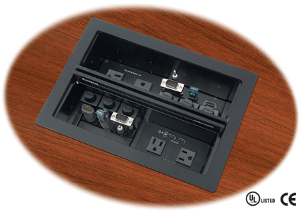 系列接線盒牢固地安裝在家具表面。安裝完畢后,其專利申請中的模塊化設計能方便地從接線盒上方對視音頻電纜和