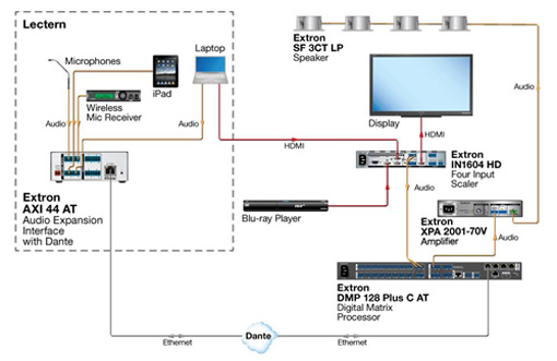 這兩款型號可通過標(biāo)準(zhǔn)局域網(wǎng)與任一具有 Dante 功能的音頻處理器,如 ExtronDMP 128