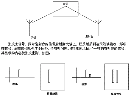 形成主信號(hào),同時(shí)發(fā)射臺(tái)的信號(hào)發(fā)射到大樓上,經(jīng)反射后到達(dá)天線被接收,形成輔信號(hào),主輔信號(hào)除強(qiáng)度不同外,還有時(shí)間差。電視機(jī)收到兩個(gè)一樣的有時(shí)差的信號(hào),其顯示的內(nèi)容就形成重影,如圖: