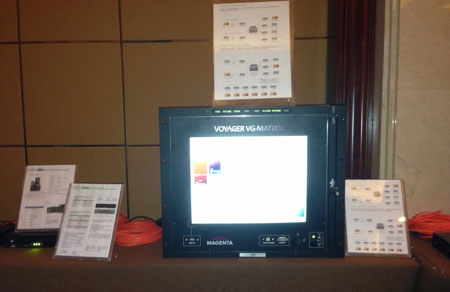 與CORIOmaster C3-540完全相同,CORIOmaster mini也采用并行視頻處理架構(gòu),該架構(gòu)與CORIO@視頻處理器緊密結(jié)合,支持多達10個獨立的視頻縮放引擎。mini是目前唯一一款延時低于2幀,每秒高達230億次視頻矩陣運算的1RU產(chǎn)品。現(xiàn)場活動的另一重頭戲是對MagentaVoyager光纖信號分配矩陣、MultiView雙絞線切換矩陣進行了重點展示及說明。
