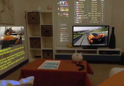[投影之窗消息] Microsoft Research建立了SurroundWeb實驗計劃,一個圓形投影裝置會首先掃描室內環境一分鐘,然后可以將網絡上的信息投射到墻上的空白位置如,并可就對象的外形作出適應性的投影,影像會以30fps來顯示,它可以同時投影25個解像度為1440×720的虛擬屏幕。Microsoft之前有一個IllumiRoom概念,焦點在游戲上,而SurroundWeb則是聚焦在網絡信息。