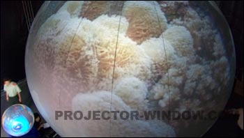 神州服聯這次展示另一個球形顯示產品是一個直徑80厘米的單機背投數碼顯示球,使用一臺4000流明的小型工程機匹配200°魚眼鏡頭,在小型背投硬質球幕的底部以非等距投影方式將數字內容投滿整個球幕的。由于采用的是非等距投影方式,投影的畫面會有較大的變形,畫面中心部分的內容會放大,而畫面邊緣部分的內容會縮小,這就要求我們在制作內容的時候先對畫面進行處理,這樣投影出來的畫面才是沒有變形的真實的畫面。如果配合紅外感應系統,數碼顯示球可以實現互動功能。本套系統一般應用在互動展示和互動教學上,如在科技館展示一些科普內容,在學校進行數字地球儀的互動教學等。