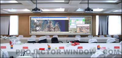 超大型交互式投影系統由兩片120寸NovaVista I系列強光正投光學屏幕橫向拼接組合而成。使用兩臺松下FD560 DLP投影機作正投吊頂固定安裝。再配置Accuon MV1000圖像處理器為投影機提供RGB電腦信號。