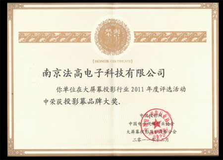 值得關注的是,南京法高電子科技有限公司歷經重重“難關”,最終一枝獨秀獲得一致認可,一舉奪得“2011年度投影幕品牌大獎”,最具含金量的大獎!