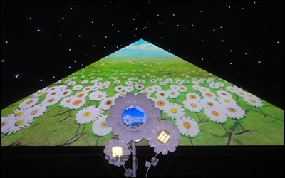“緬懷廳”中的巨型三角形異形屏幕也非常搶眼,該屏幕底邊為6.3米,高為7米的等腰三角形。 |