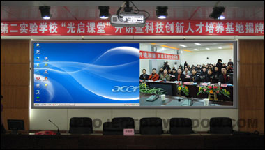 ATER圖形處理器及智能控制設(shè)備,實(shí)現(xiàn)了屏幕高2米、寬4.8米的高分辨率、大畫面的信息顯示,達(dá)到了畫面清晰、亮麗和整體感強(qiáng)的顯示效果。本套系統(tǒng)中電腦、視頻會(huì)議、有線電視和DVD均可作為輸入信號(hào),單個(gè)信號(hào)全屏顯示和雙分屏顯示、疊加顯示都得到支持。當(dāng)然,為了使教學(xué)員工和學(xué)生們簡(jiǎn)單方便地應(yīng)用此套系統(tǒng),ATER還為其設(shè)計(jì)了可通過(guò)彩色無(wú)線觸摸屏選擇和切換的模式。