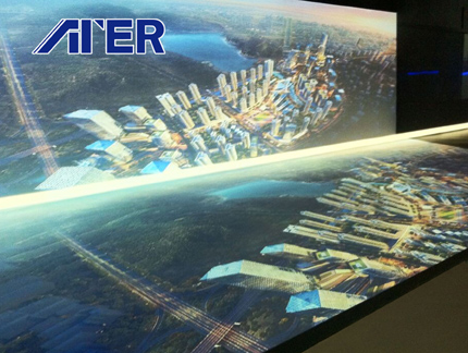 “該系統最大的難點在于立面展示和3D立體沙盤之間呈120度傾斜角,并且顯示分辨率由于位置的不同也有所不同,分別為2700*768和2720*1350”,ATER技術工程師philip說,“為了能保證兩個面的完全接溶,圖像一致、完美呈現。我們這次選用了‘T’系列圖像融合處理器,此系列產品支持65*49像素分格微調,最小支持1/256像素幾何校正,可實現各種非規則藝術幾何操作,特別是配合定焦投影機顯示時,更能體現出它的優勢。且‘T’系列能夠支持目前所有常見顯示分辨率,同時兼容特殊分辨率。” |