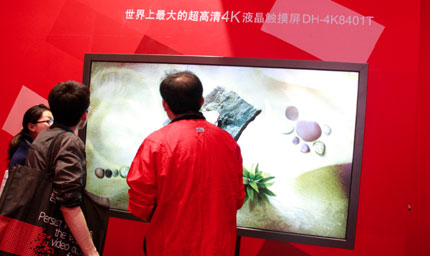 平板區—等離子拼接 德浩等離子拼接屏的接口得到了新的升級,采用高效的HDbaseT接口,HDbaseT支持最高20Gbps的傳輸速率,能更好地支持未來的3D和2K*4K視頻格式,傳輸采用普通的CAT5e\6網絡線纜,連接器也采用普通的RJ45街頭,而傳輸距離達到了100米。在山寨拼接產品充斥的大屏拼接市場,德浩整機大屏幕拼接的實際效果,讓人和人的眼睛滿心舒暢,實際效果非一般拼接能比擬。 平板區—大畫面觸摸屏 為了滿足商業顯示市場需求,德浩最新推出世界上最大的超精細4K液晶觸摸拼接屏—DH-4K8401T