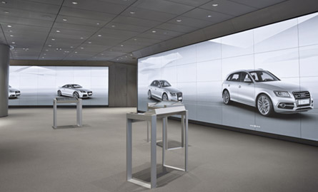 奧迪城的創新展廳給廣大觀眾呈現出一種更高程度的直觀體驗。新型的產品展示方式,比如等離子拼接墻以及多點觸控臺,有利于主動展示全系列的品牌模型。游客能以虛擬方式從上百萬的配置中組裝車輛,享受1:1規格高清質量的體驗。一些技術性的細節,比如發動機、外殼、LED技術或駕駛培訓也能以個人為單位進行展示。在首層,裝有6大拼接屏幕墻,總演示面積達到94平方米。 |