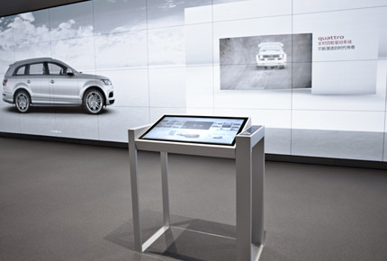 客人可以在影幕上觀看360度的車輛展示,駕駛情景和車輛內飾,也可更進一步欣賞驅動系統、車身框架、LED科技等技術細節。不僅如此,客人還可以通過左右移動身體來控制影幕。這是中國汽車行業第一次采用這種產品演示方法。Audi