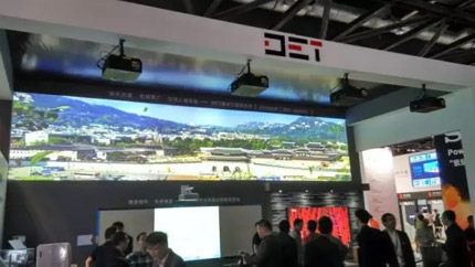 . DET激光工程投影機S系列支持5款不同焦距鏡頭和6500流明的恒定高亮畫面,滿足不同場合的應用需要,如各種大型會議、大廳、展廳等。此次展會上展出了四臺工程機DET-S65WU的融合效果,通過全新的色彩微調功能,RGB進階調整功能及Gamma,調整投影畫面色彩和灰度,使多臺投影機之間的亮度和色彩達到一致,滿足客戶拼接或者融合畫面一致性的要求。
