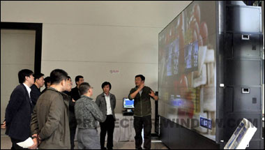 工程師為參觀者講解5.3mm超窄拼縫液晶顯示單元的電動前維護功能 |
