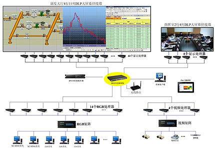 系統采用一套DVCS分布式控制系統對調度大廳4×11 DLP大屏幕和指揮調度室2×4 DLP大屏幕統一控制,利用基于TCP/IP架構的DVCS分布式控制系統優異的網絡互通性能,前端計算機信號、超高分辨率GIS圖、視頻信號、IP攝像頭等信號接入對應的視頻或RGB處理器轉化為網絡碼流,通過網絡傳輸,在兩套DLP大屏幕上進行任意調度顯示呈現。整個系統配置一臺安裝B/S架構大屏幕控制管理軟件的控制服務器,通過IE登陸,實現多用戶、多任務靈活控制。所調入信號能在兩套大屏幕內任意開窗、任意大小、任意位置、任意疊加、移動、漫游顯示。控制系統可以實現兩套DLP大屏幕畫面互相鏡像功能,實現調度大廳顯示墻與指揮室顯示墻之間的全屏同步鏡像顯示,有利于指揮室領導決策指揮,同時做到信號顯示互相備份。