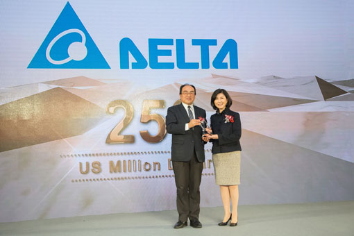 臺(tái)達(dá)連續(xù)七年入選臺(tái)灣20大國際品牌,品牌長郭珊珊(右)代表領(lǐng)獎(jiǎng)