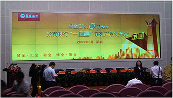 [投影之窗消息]  招商銀行股份有限公司(總行)視頻中心作為招商銀行全球視頻會議的中心,大屏系統采用了深圳展視公司的3×7,67英寸DLP高清投影單元、三菱VC-X3000圖形拼接處理器以及配套的其他系統組成,并和日立高清攝像機,保利通視頻會議系統等相關設備組合成一個目前世界上最先進的多功能視頻會議系統。