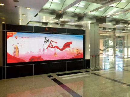 人民日?qǐng)?bào)社大廳,Prysm(溥美)大屏向來(lái)訪者展示人民日?qǐng)?bào)社的光榮歷史。