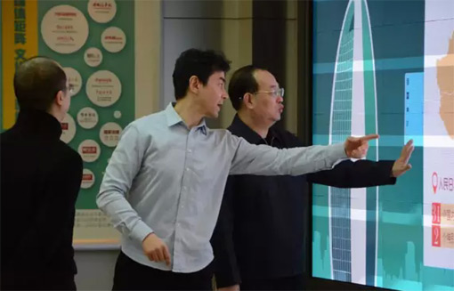 人民日報社楊振武社長(右)在Prysm(溥美)副總裁兼大中華區總經理李曉明(中)的陪同下,視察Prysm(溥美)大屏的互動體驗,之后楊振武社長用Prysm大屏向習近平總書記進行了工作成果的匯報。