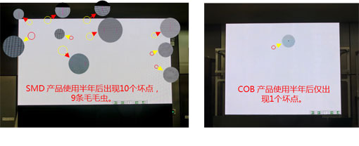 ①性能更可靠。沒有燈珠封裝、回流焊、貼片等工序的COB小間距LED產品,穩定性大大提升,并能有效避免傳統SMD封裝壞點越來越多的缺陷。經測算,大約在使用半年后,采用COB封裝技術的小間距LED累積壞點率不到采用SMD技術的十分之一。