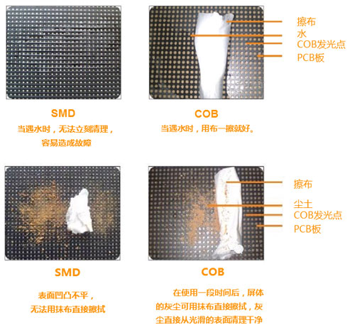 ③適應性更強。COB封裝技術,無裸露燈腳,表面平滑無縫隙,具有防潮、防靜電、防磕碰、防塵等功能,正面防護等級達到IP54,避免了SMD封裝的小間距LED因潮濕、靜電、灰塵、磕碰等環境或人為因素造成死燈、壞燈的問題。