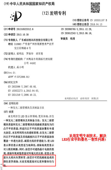 對此, 威創已經解決了此問題,并申請了專利,結合威創DLP屏幕的特殊覆膜工藝解決墨色一致性問題,確保了COB小間距LED產品整墻顯示效果。