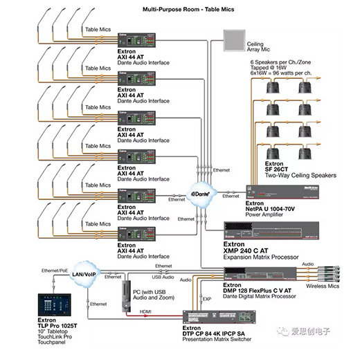 擴展的系統可支持具有多路輸出的定向陣列麥克風,以及其它多個 Dante 信號源,