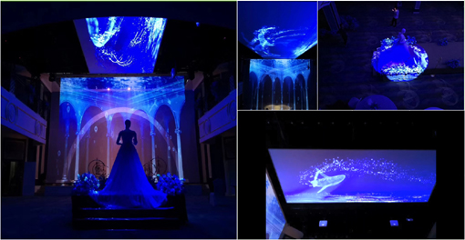 本次沉浸婚禮宴會廳的頂部,是由兩臺激光工程投影機LU-P500W投射而成的4*10米超長畫面。同時,兩臺激光超短焦投影機LU-U500置于舞臺前方,通過拼接融合在宴會廳正面投射出10*6米的超大畫面。此外,兩臺LU-U500在舞臺頂部拼接投影,向新娘婚紗投射出動態效果。