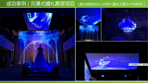 得益于多媒體顯示在婚禮中的廣泛應用,以及年輕人追逐個性時尚的消費習慣,3D全息沉浸式婚禮的熱潮迅速蔓延。憑借高能效、高壽命以及精細色彩顯示等優勢,宏碁激光投影機通過六臺組合打造全息數字化場景,參會者可以瞬間沉浸在海底世界、原始森林、浩瀚宇宙、幽深古堡、浪漫花海和奇妙卡通等各種虛擬場景中。沉浸婚禮宴會廳的頂部,是由兩臺激光工程投影機LU-P500W投射而成的4*10米超長畫面。同時,兩臺激光超短焦投影機LU-U500置于舞臺前方,通過拼接融合在宴會廳正面投射出10*6米的超大畫面。此外,兩臺LU-U500在舞臺頂部拼接投影,向新娘婚紗投射出動態效果。