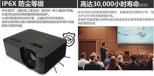 LU-X110W激光投影機(jī)在開啟eco模式后使用壽命最高可達(dá)30000小時(shí),就算每天使用8小時(shí),大約10年內(nèi)也無需更換光源,更低的維護(hù)、更換成本也令LU-X110W成為教室、會(huì)議室等高頻次投影的理想選擇;而靈活的360°投影配合7*24小時(shí)不間斷投影也讓LU-X110W十分適合在公共展覽或是展廳內(nèi)使用。