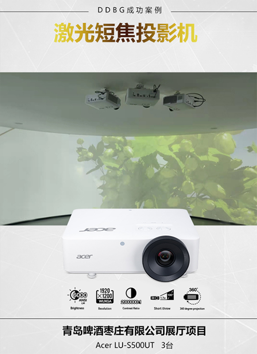 宏碁激光短焦工程投影機(jī)LU-S500UT進(jìn)駐青島啤酒某分公司的沉浸式展示體驗(yàn)區(qū),通過3臺(tái)激光短焦工程投影機(jī)融合展示了8m*2.5m的巨幅畫面,多層次互動(dòng)光影的新媒體展示,讓參觀者身臨其境的體驗(yàn)百年青啤歷程與文化。
