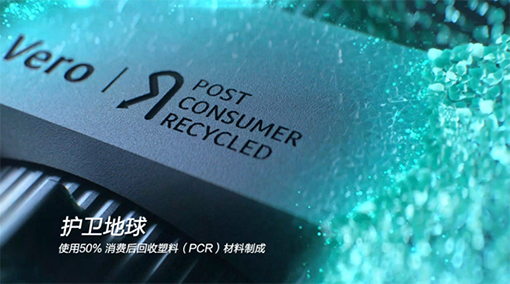 消費(fèi)后回收塑料(PCR)材料制成,減少原生塑料的使用量并改用回收材料,通過(guò)再減少、再利用、再循環(huán),以達(dá)到減少生產(chǎn)過(guò)程中生產(chǎn)廢料。在設(shè)計(jì)上將投影機(jī)的整體尺寸減少大約33%,包裝使用85%的再生紙。
