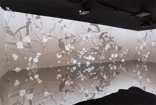 接下來,進入“時空隧道”,這個展廳完全由鏡面組成,達芬奇的畫作與同一時期中國“明四家”的作品漂浮于四壁與地面,西方文藝復興與東方禪意人文在光影中交織。我們被絢麗影像包裹,置身藝術幻境。這里共裝配了7臺AL-DH620與1臺AL-DH800,精密的規劃與設計讓影像空間更完整,具有震撼且舒適的視覺觀感。