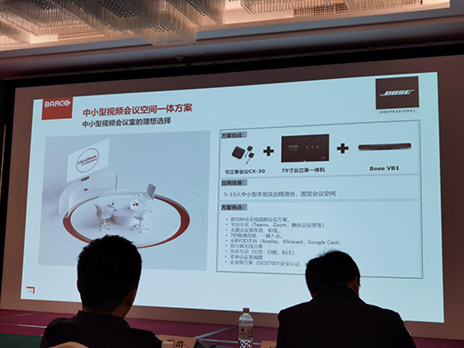 隨后,巴可中國區商用渠道經理與中國區北區銷售經理先后登臺進行市場規劃分享。作為視頻會議創新道路上的領軍者,巴可圍繞著顯示技術、投影技術、無線協作連接技術三大模塊對圖像處理“精打細磨”,與“專注聲音”的BOSE形成良好的優勢互補。而針對當下的無線視頻會議需求,巴可以“可立享”產品為主體,為客戶提供了優質的協作連接解決方案。