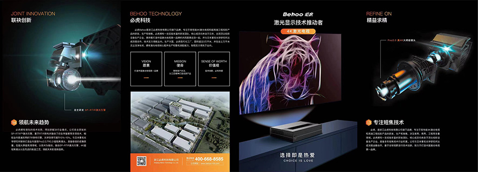 必虎Behoo專注于高性能4K激光電視和超高端工程投影產(chǎn)品的研發(fā)、生產(chǎn)和銷售,擁有一支經(jīng)驗(yàn)豐富的研發(fā)團(tuán)隊(duì),核心成員均來(lái)自于日本、臺(tái)灣頂尖投影設(shè)備生產(chǎn)企業(yè),秉持著打造中國(guó)激光電視創(chuàng)新領(lǐng)導(dǎo)品牌的共同愿景走到一起,并與日本木下光學(xué)研究所、浙江大學(xué)達(dá)成深度合作,技術(shù)實(shí)力領(lǐng)航業(yè)內(nèi)。