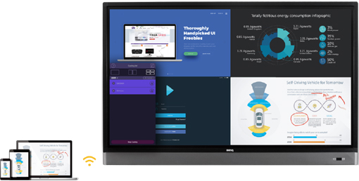 在小組討論中,學生可以通過BYOD(自帶設備)無線分享到老師的主屏幕上,也可以通過分屏方式展示討論中的多個階段成果,幫助學生更好地分享團隊創見,大膽表達意見。