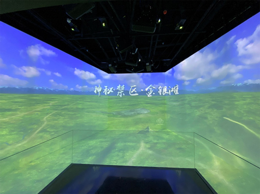 在《神秘禁區(qū)》方案中,12臺(tái)明基激光工程投影機(jī)分別對(duì)左、右、前、下四面幕布?jí)M(jìn)行融合投影,站在中間觀賞,視野完全被投影所覆蓋,其畫面一移動(dòng),感覺人也在移動(dòng),從室內(nèi)來到廣袤無垠的草原,探索藏在禁區(qū)內(nèi)的核工業(yè)基地。