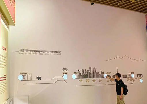 展覽設計中從主題、內容、精神、空間、體驗、形式等多方面綜合表達,打造出一座藝術性的表現空間,以“聲、光、影、物”設計概念重織時空、展示文物、講述黨史、展望未來,給觀者以全新的體驗空間。