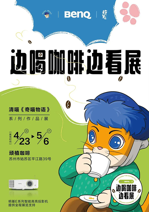 不少過往游客被店門口寫著“邊喝咖啡邊看展”的活動信息牌所吸引,而當他們走入店內,將會發現這里正在進行由明基E系列投影機聯合插畫藝術家清喵及頑植咖啡共同舉辦的《奇喵物語》微展覽。