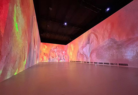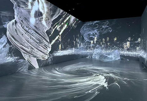在全黑的環境中,通過“墻面+地面”的全方位投影,觀眾被完全帶入作品的世界,感受不同于傳統藝術的全新體驗。