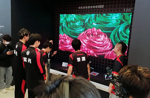 受邀來到發布會的成都AG超玩會明星體驗官們在現場參觀時,都被120C9的超大尺寸、超高清、超真彩的高品質畫質所吸引,紛紛駐足觀影體驗。
