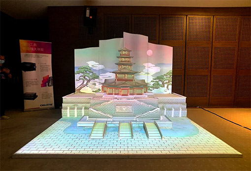 另一個亮點則是一場迷人的中國風實景演藝3D投影秀,它在一座長6米、高3米的仿古塔樓模型上進行。這場投影秀配置了三臺20,000流明的科視Christie