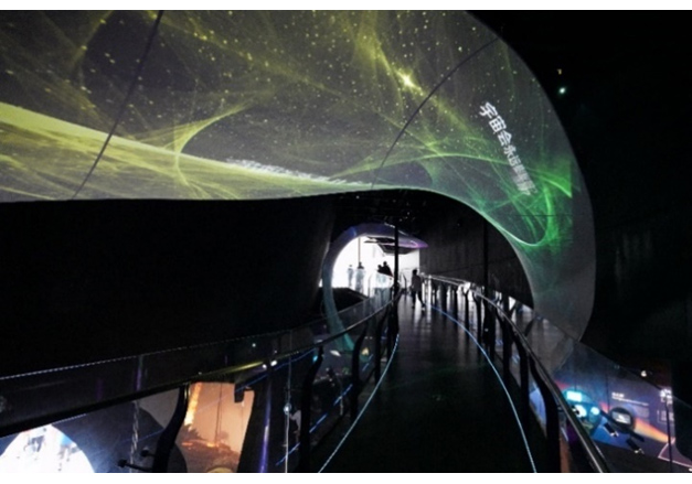 “征程”展區中的“未解之謎”展項令人過目難忘,長度約50米的光影飄帶包裹環繞觀眾出口走廊,并緩緩運動。出色的影像效果由10臺科視DWU630-GS激光投影機呈現。未解之謎光影飄帶的迷人效果是通過科視Christie