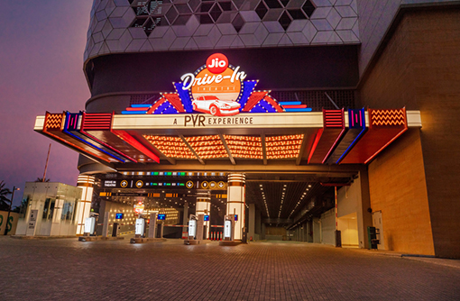 Jio 免下車劇院可容納 290 輛汽車,配有一塊 25.5 米寬的巨型銀幕(圖片由 PVR Ltd