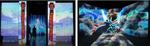 “守護村莊的長栍和鳥桿”(左)與“司雨之神龍神”(右)展區的投影效果