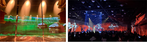 《昭君出塞》紗幕投影(左);三樓劇場四面舞臺上的沉浸式視覺效果(右)。