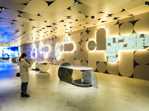 展廳中庭有3面陶瓷質地的展示桌面,分別由3臺6,000*1*2流明的愛普生激光工程投影機CB-L1060UNL搭配ELPLU03鏡頭組成,中庭的設計融入了設計師大高啟二的“五感”設計理念,桌面伴隨著小魚游走,以及現代感十足的線條畫面,為參觀者提供樂趣,產生感懷,營造“心動空間”。