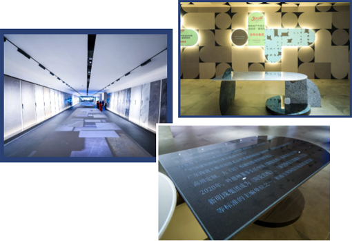 細膩的瓷磚紋理搭配潮流大氣又不失有趣的光影效果,走進展廳仿佛步入瓷磚博物館。映入眼簾的便是企業展示背景墻,它由1臺12,000流明*1*2的愛普生激光工程投影機CB-L1515SNL搭配ELPLX02超短焦鏡頭組成,光影游走于瓷磚之上,為整個展廳營造出簡約時尚的藝術氛圍。