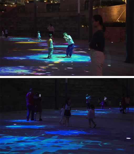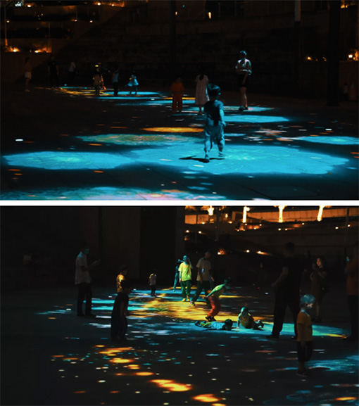 夜幕來臨,下沉廣場地面上時而萬花綻放,彩蝶聞香飛舞。時而鯨躍海面魚群相伴共舞。