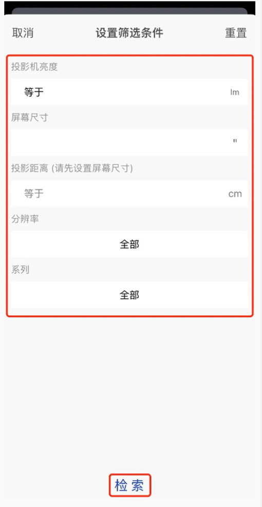 首先我們打開(kāi)愛(ài)普生投影機(jī)距離APP主頁(yè),點(diǎn)擊菜單欄,輸入自己的篩選條件,